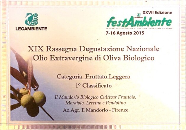 In 2015, we won the 1st prize nationally among over 100 companies participating in the light fruit category with our flagship product, Organic Extra Virgin Olive Oil Blend of the main Tuscan cultivars: moraiolo, frantoio, leccino and pendolino.